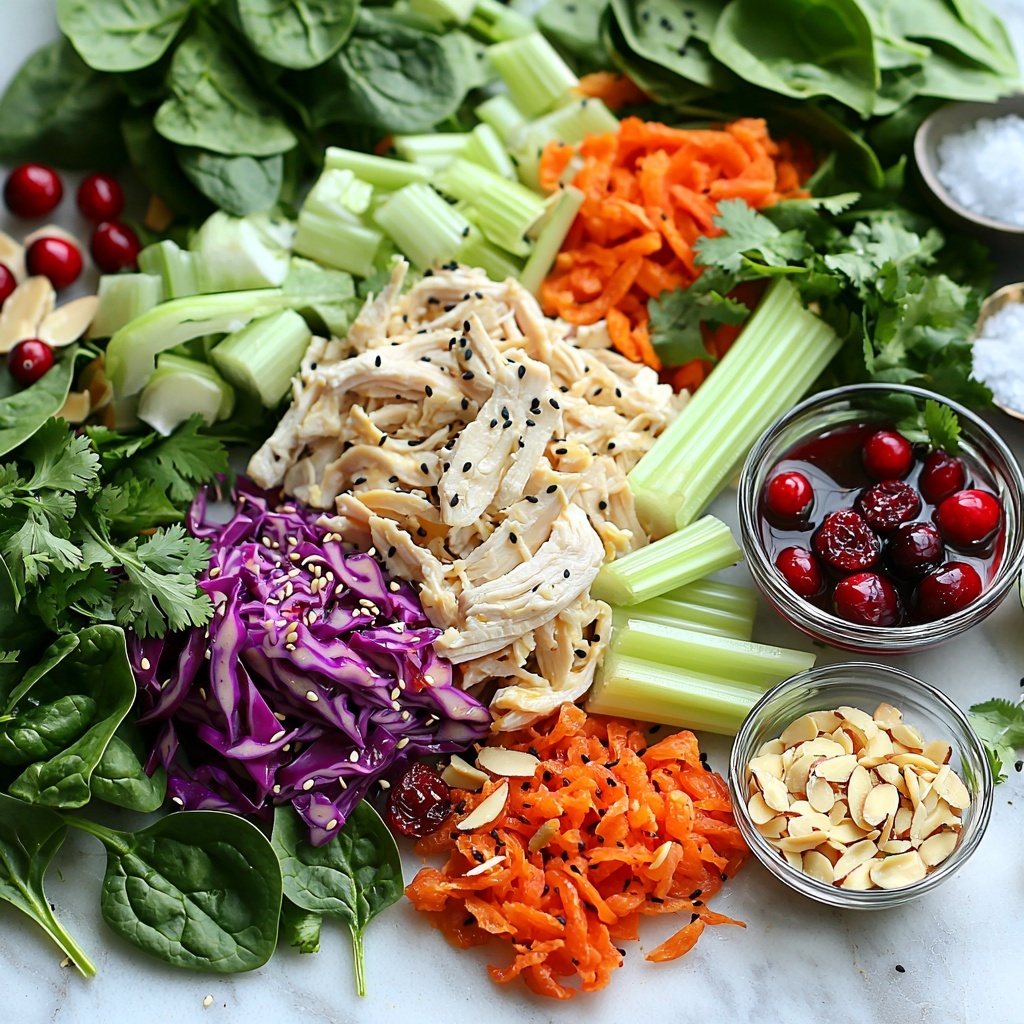 In a large bowl, toss together the chopped spinach, shredded red cabbage, grated carrots, diced celery, and sliced green onions. This colorful, crisp blend forms the heart of the salad and offers a satisfying crunch that contrasts wonderfully with the softer chicken.