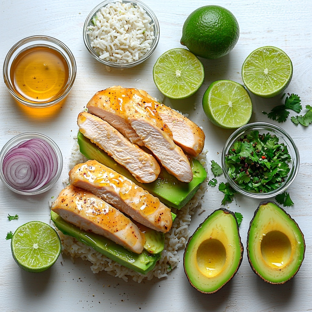 This recipe keeps things straightforward with essential ingredients that each play a crucial role in creating a balanced, delicious dish. From the juicy chicken breasts marinated in a tangy honey-lime blend to the fragrant jasmine rice and creamy avocado topping, every component adds its own magic to the Avocado Chicken Rice Stack with Lime Recipe.