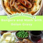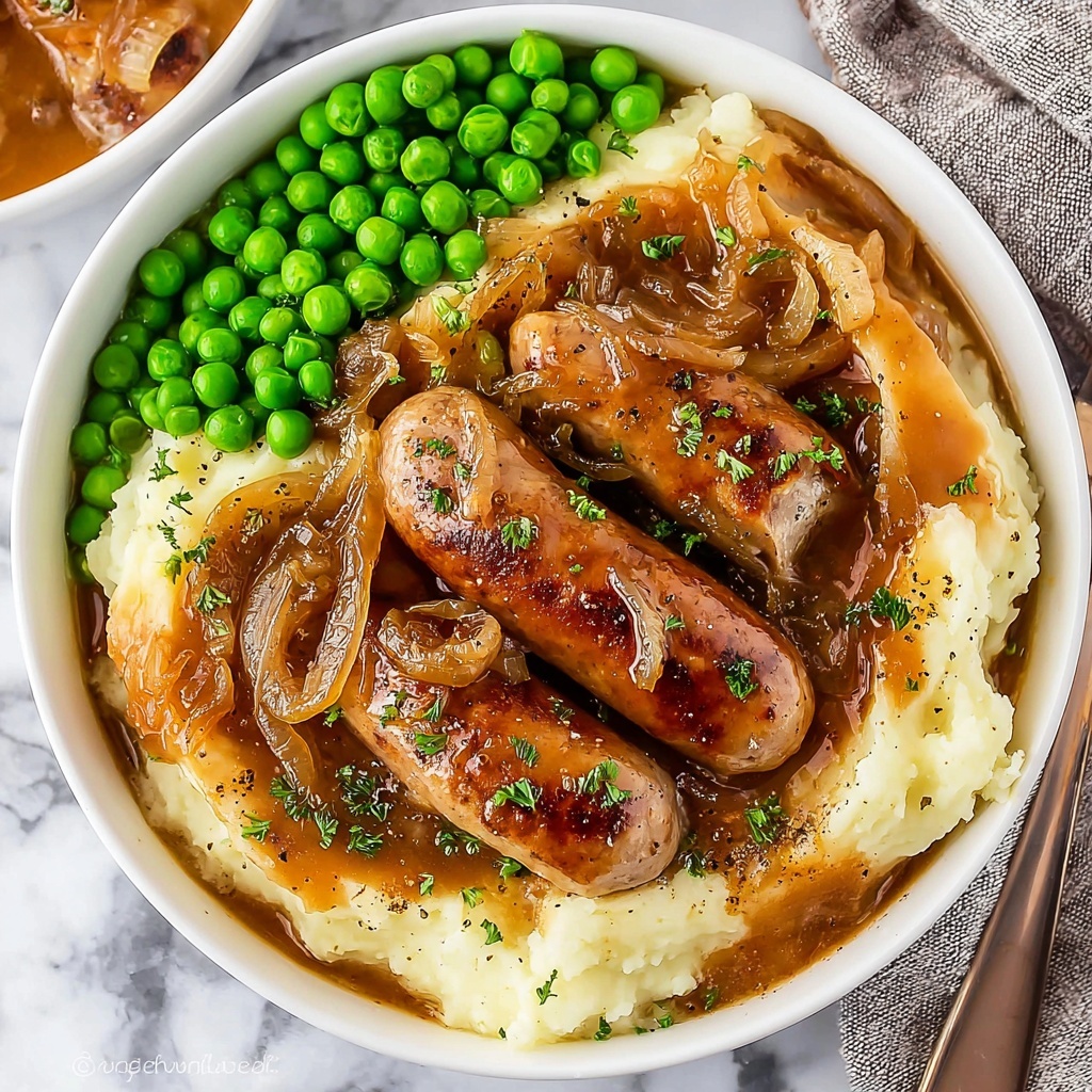 - Serve: Plate the sausages over creamy mashed potatoes, generously ladle the onion gravy over the top, and serve alongside cooked peas for a complete meal.