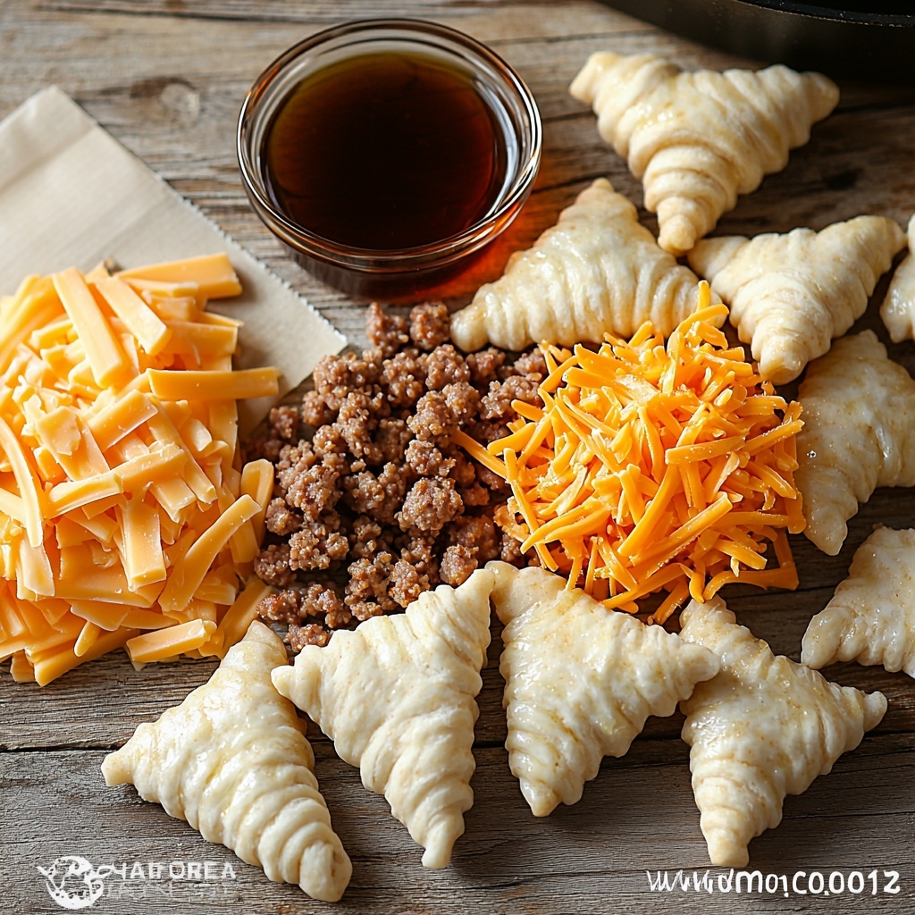 - Fill Dough: Place a spoonful of the browned sausage and a sprinkle of shredded cheddar cheese on the wide end of each crescent dough triangle.