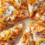 This Buffalo Chicken Pizza combines the spicy tang of buffalo sauce with the creamy richness of blue cheese and mozzarella on a crispy homemade pizza crust, topped with banana peppers and red onions for a perfect balance of flavors and textures. Ideal for a quick and flavorful dinner that delivers a fun twist on classic pizza.