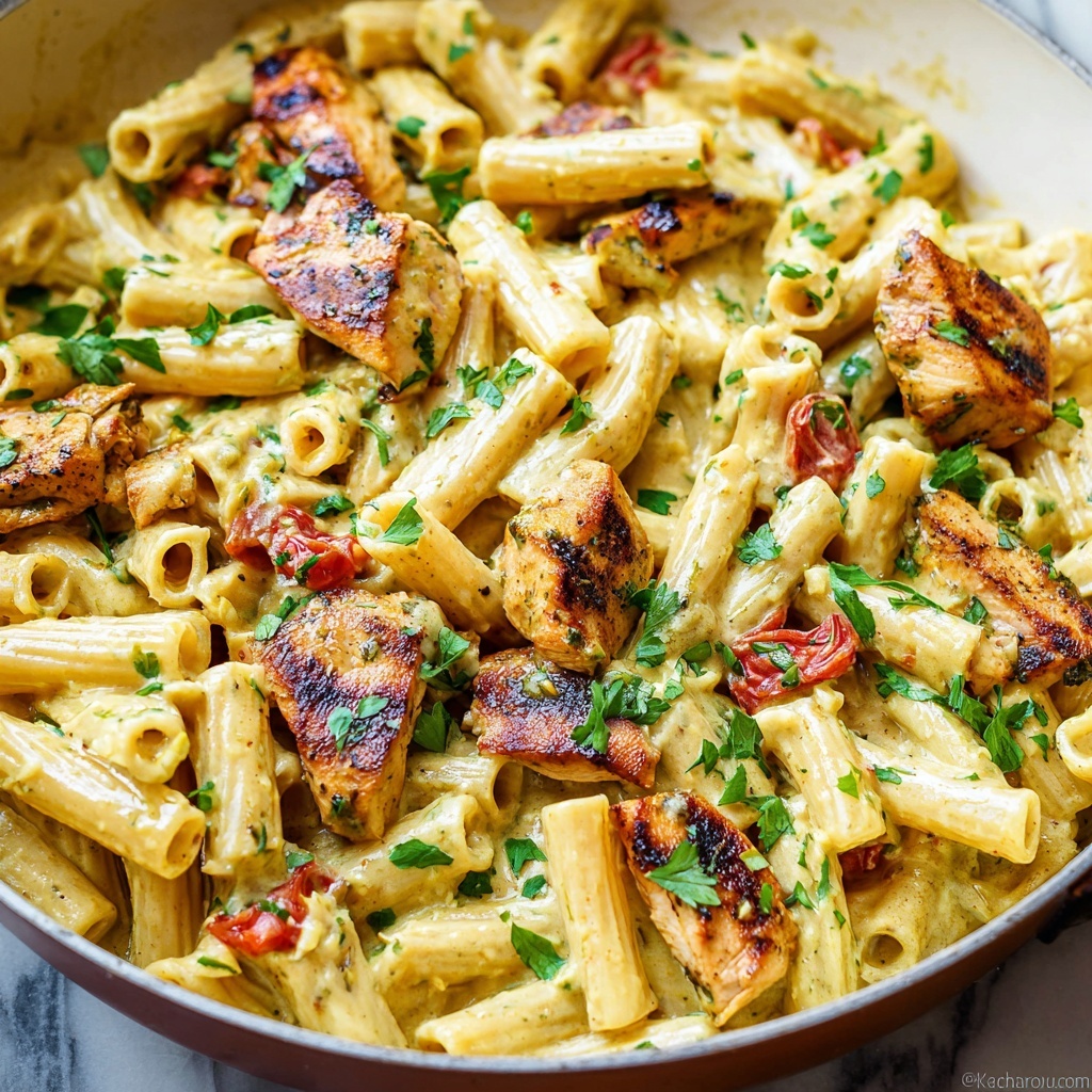 Start by boiling the penne pasta in salted water according to the package instructions until it’s perfectly al dente—tender yet firm to the bite. Once cooked, drain it well and set aside while you prepare the star of the show: the chicken and sauce. This step ensures your pasta remains the perfect base for all that luxurious goodness to come.