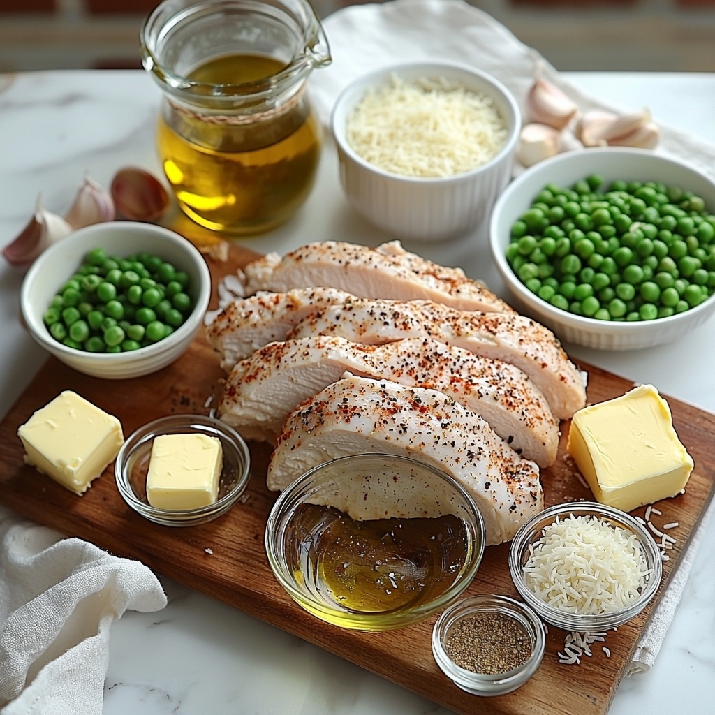 - Assemble Casserole: Preheat oven to 350°F (175°C). In a large bowl, combine the baked chicken, cooked rice, Alfredo sauce, and thawed peas. Mix well.