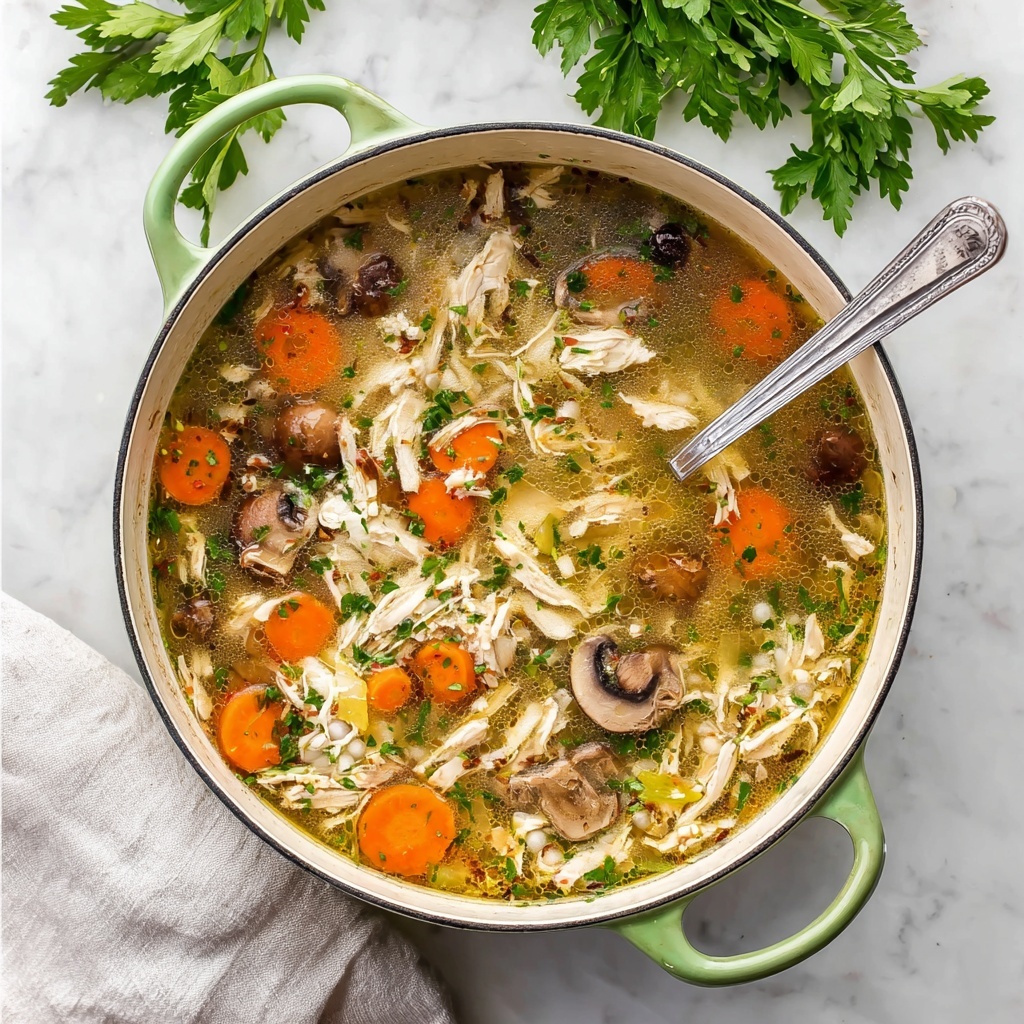For a fun twist, serve your Chicken and Mushroom Soup Recipe in hollowed-out bread bowls for an impressive presentation that also boosts the comfort factor. Another idea is layering the soup over a bed of fresh arugula in shallow bowls, creating a mix of textures and a pop of color. You could also turn the soup into a creamy bisque by blending part of it and garnishing with a drizzle of truffle oil or fresh herbs for a restaurant-quality touch at home.