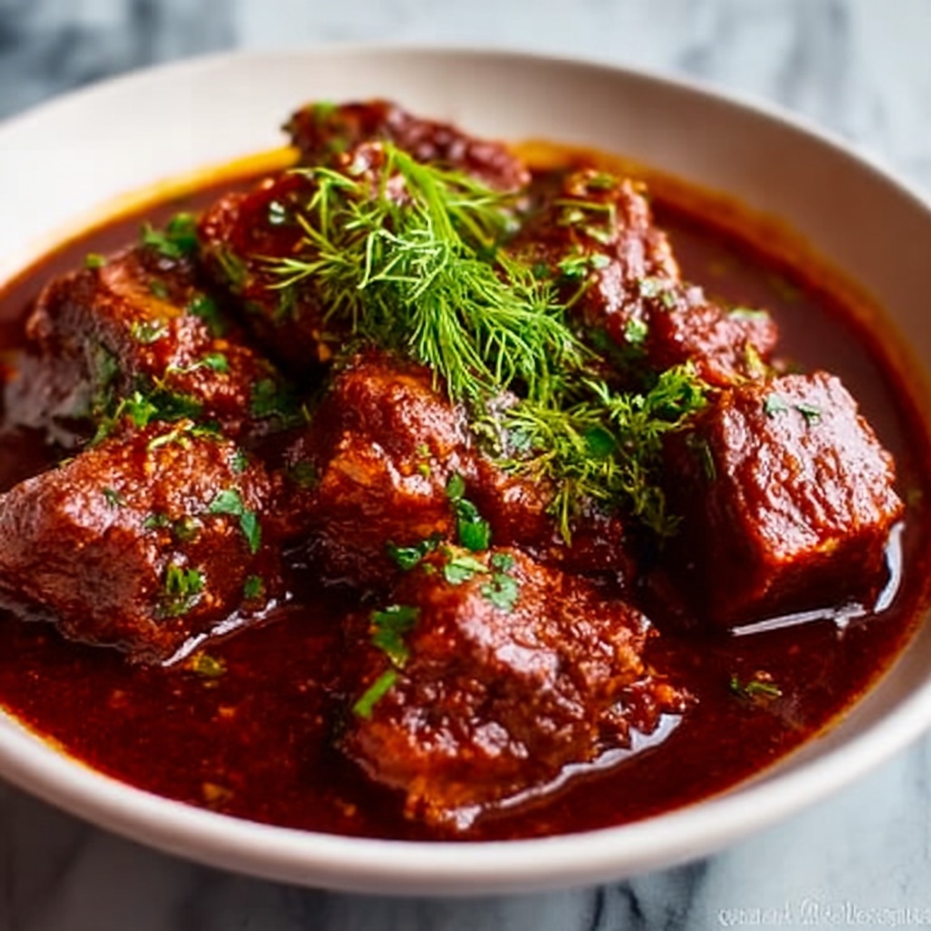 Gently reheat the curry on the stovetop over medium-low heat, stirring occasionally and adding a splash of water if needed to loosen the sauce. Avoid microwaving if possible, as slow reheating helps retain the tender texture and complex flavors.