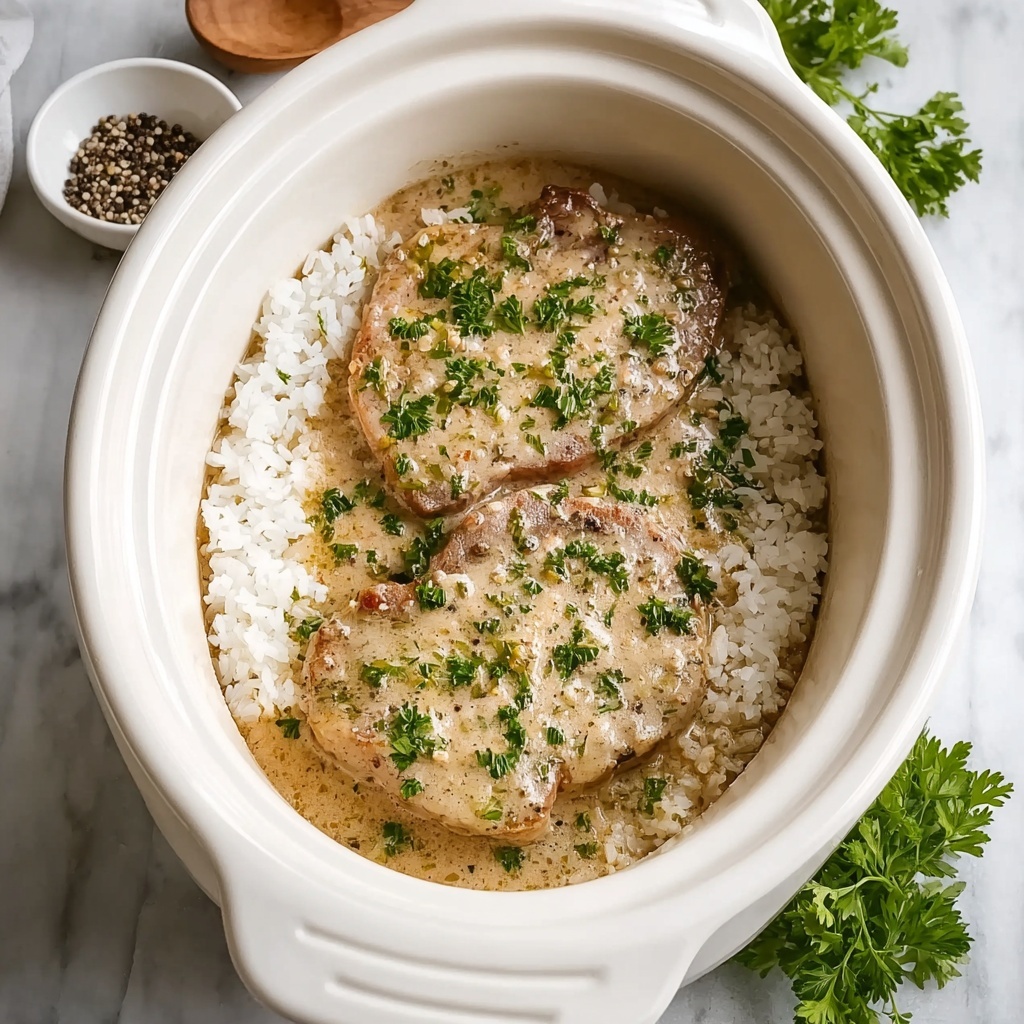 Lay the pork chops gently on top of the rice mixture in the crockpot. Cover the pot with its lid, set the temperature to low, and cook for about 4 hours. This slow cooking allows the pork to become tender without drying out while the rice absorbs those savory juices, becoming creamy and delicious.