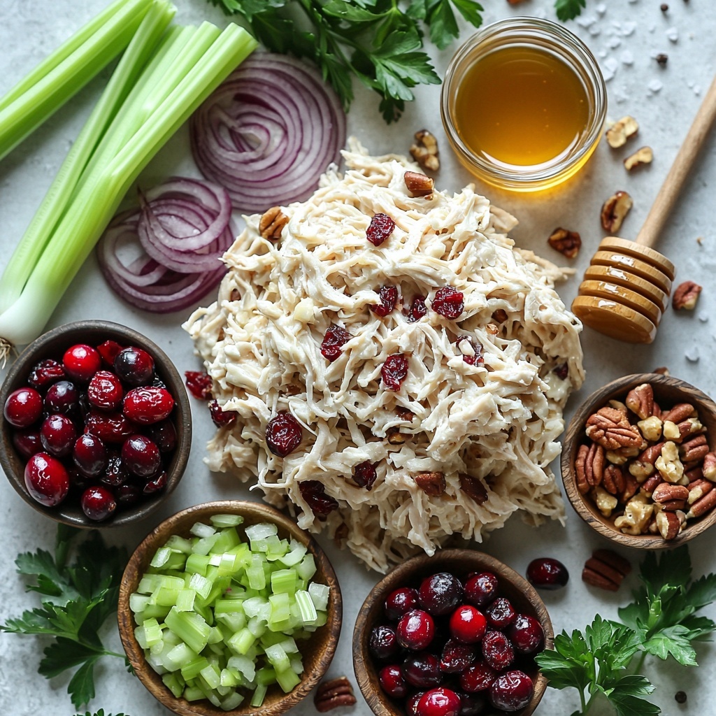 - Combine Chicken and Mix-ins: In a large bowl, combine the shredded chicken, dried cranberries, chopped pecans, finely chopped celery, and diced red onion, ensuring all ingredients are evenly distributed.