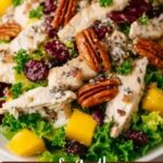 Pour the dressing over the chicken mixture and gently toss everything together until all the ingredients are evenly coated. Be careful not to overmix to keep the pecans crunchy and the cranberries intact.