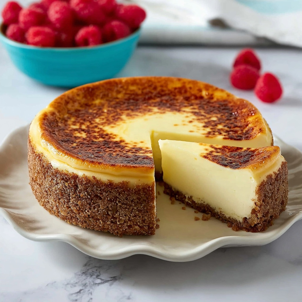 When ready to serve, gently remove the cheesecake from the springform and place it on a serving plate. Evenly sprinkle 2 to 3 tablespoons of sugar on top and use a butane kitchen torch to caramelize the sugar until you achieve a crisp, golden crust just like the classic creme brûlée. This final step adds an irresistible crunch and that coveted burnt sugar aroma.
