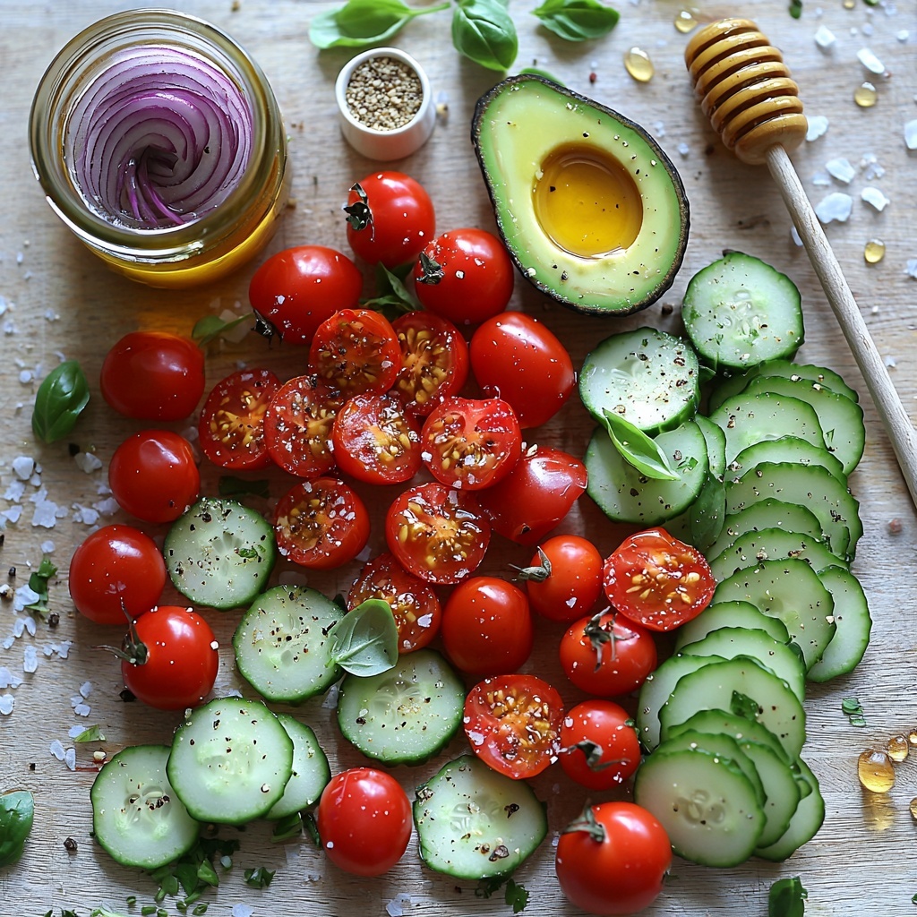 Start by thinly slicing the cucumber into half-moons to ensure each bite has just the right crunch. Halve the cherry tomatoes to release their juicy sweetness and cube the avocado so its creamy texture comes through beautifully. Finely chop the red onion for a gentle bite that will contrast nicely with the other fresh ingredients. Toss all these together in a large serving bowl along with the freshly chopped herbs – we love chives, parsley, and basil for their fragrant freshness.