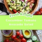 If you have any leftover Cucumber Tomato Avocado Salad Recipe, store it in an airtight container in the refrigerator and enjoy it within 3-4 days. Keep in mind the avocado might start to brown over time, so consuming it sooner will keep the best texture and taste.