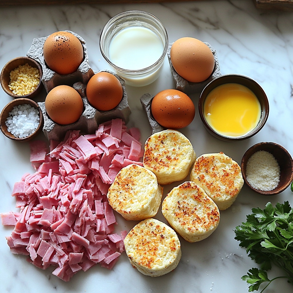 - 6 English muffins halved: These provide a sturdy, slightly crispy base that soaks up the rich egg mixture beautifully.