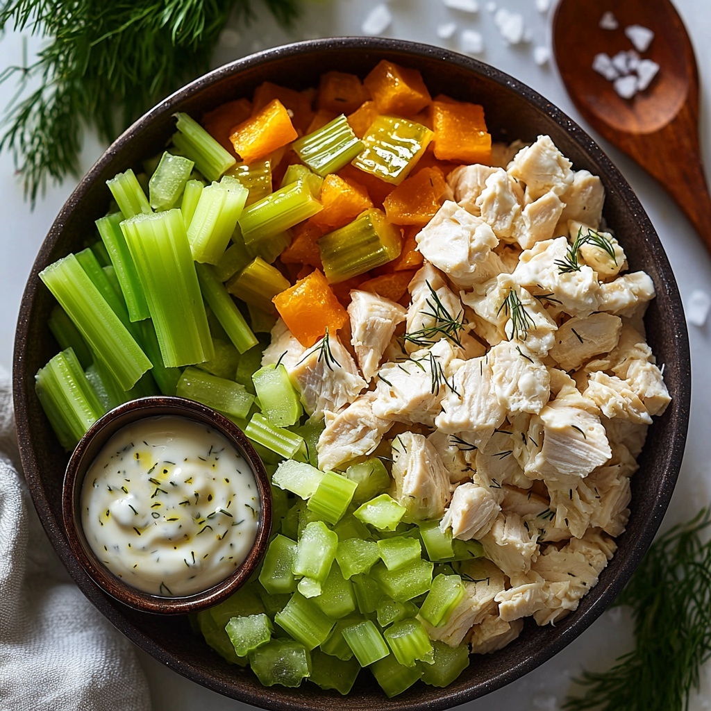 Start by tossing the chopped, cooked chicken with the finely diced celery, sweet onion, dill pickles, and optional fresh dill in a large mixing bowl. This combination is the vibrant base, melding crunch with tender chicken.