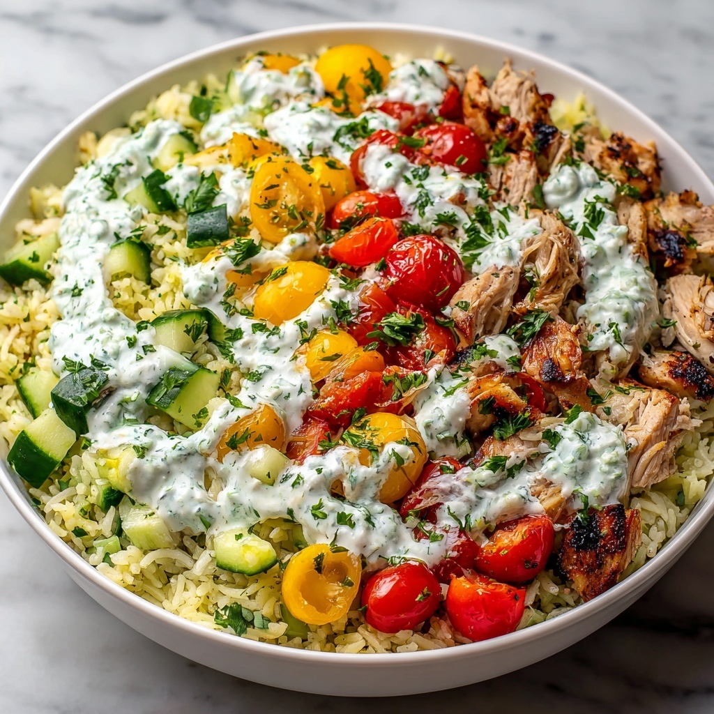In that bowl, toss together the shredded chicken, tzatziki sauce, cooked rice, diced cucumbers, cherry tomatoes, and crumbled feta cheese. Mixing all these vibrant ingredients is like creating a flavor party, where every bite promises freshness and comfort.