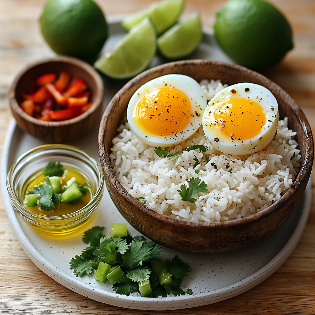 - Lime wedges add acidity to balance the richness of the eggs and rice.