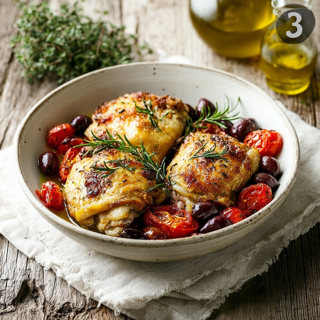 Scatter halved cherry tomatoes and pitted Kalamata olives around the chicken. As they roast, the tomatoes will soften and sweeten, while the olives release their briny essence, perfectly complementing the chicken.