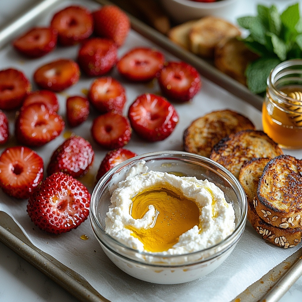 Start by preheating your oven to 375°F (190°C). This temperature ensures your strawberries roast to their sweetest potential without burning. Slice the strawberries and gently toss them with a tablespoon of balsamic vinegar; this step intensifies their natural flavors and adds a balanced acidity that complements the ricotta wonderfully. Spread them evenly on a lined baking sheet and roast for 15 to 20 minutes until they’re bubbling and fragrant, caramelizing into a luscious topping.
