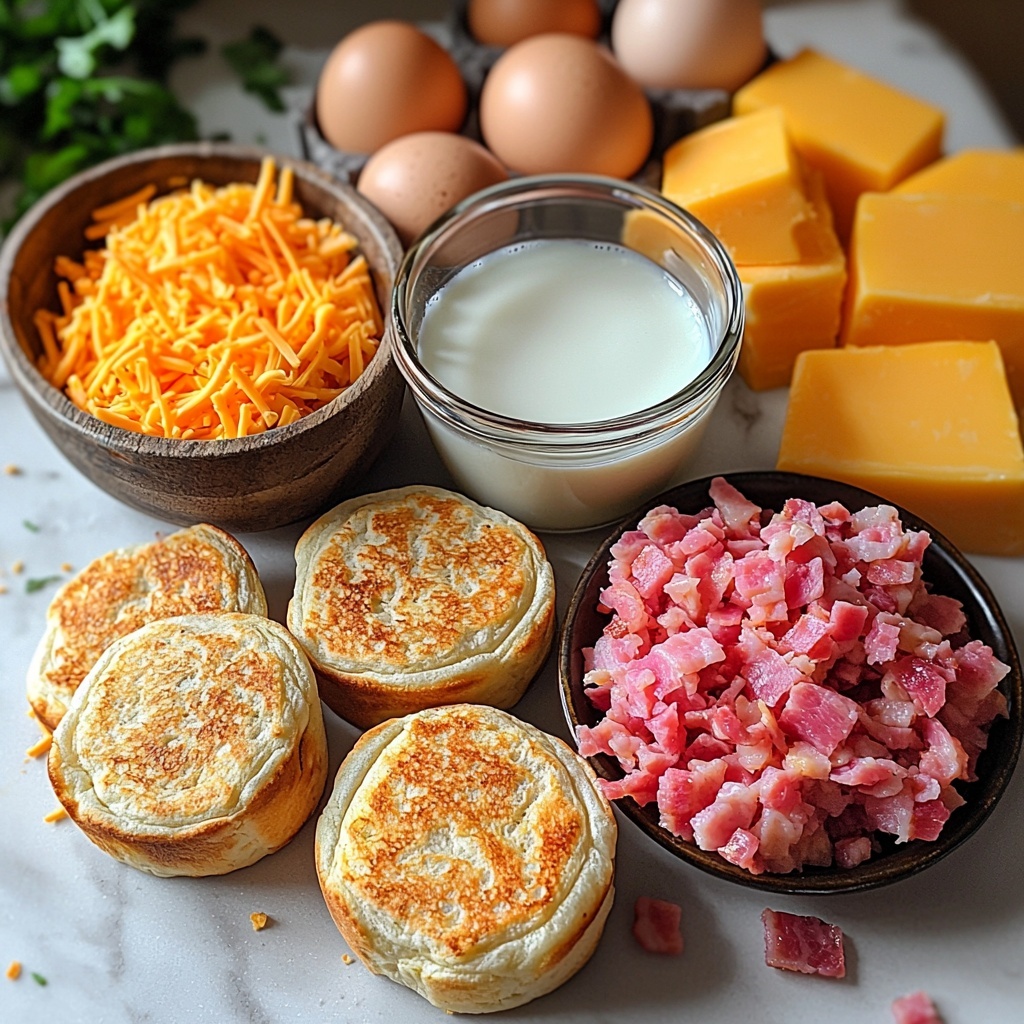 • English muffins: Quartered to soak up the rich egg mixture while providing a sturdy base with a slight crunch.