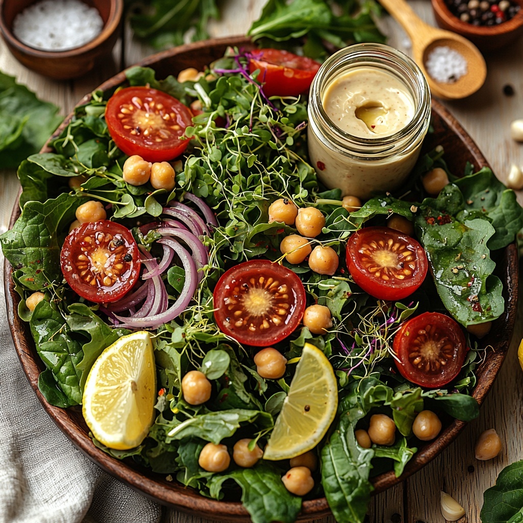 A fresh and vibrant green salad featuring a mix of spring greens, cherry tomatoes, shallots, and protein-rich chickpeas, all brought together with a creamy, zesty lemon tahini dressing. Perfect as a quick, nutritious meal or side dish that takes just 10 minutes to prepare.