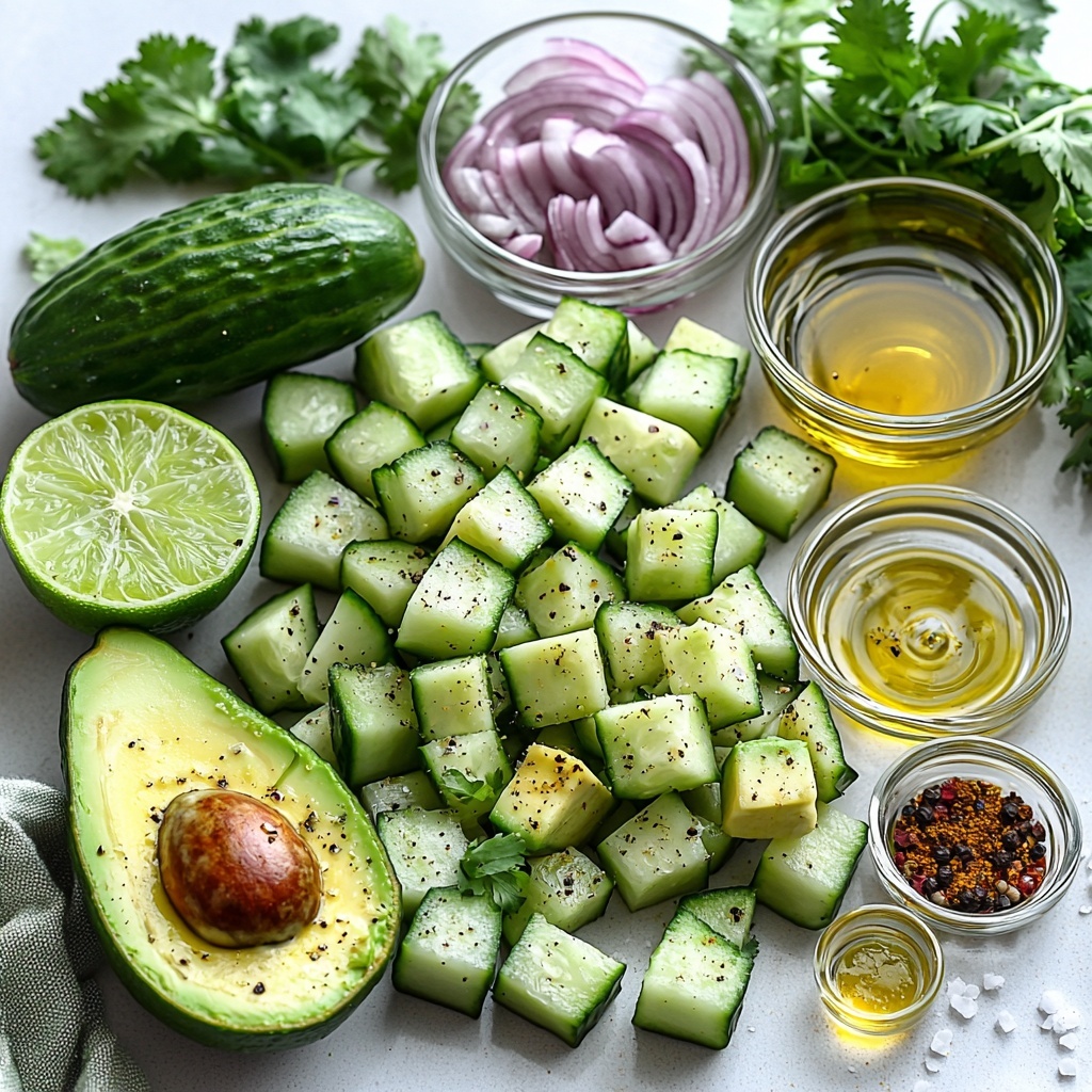 This Healthy Cucumber Avocado Salad with Tangy Lime & Cilantro Recipe is built on simple, wholesome ingredients that each play a crucial role in creating a perfectly balanced dish. From the cooling crunch of cucumber to the buttery smoothness of avocado, every component adds texture, color, and flavor depth that makes this salad a standout.