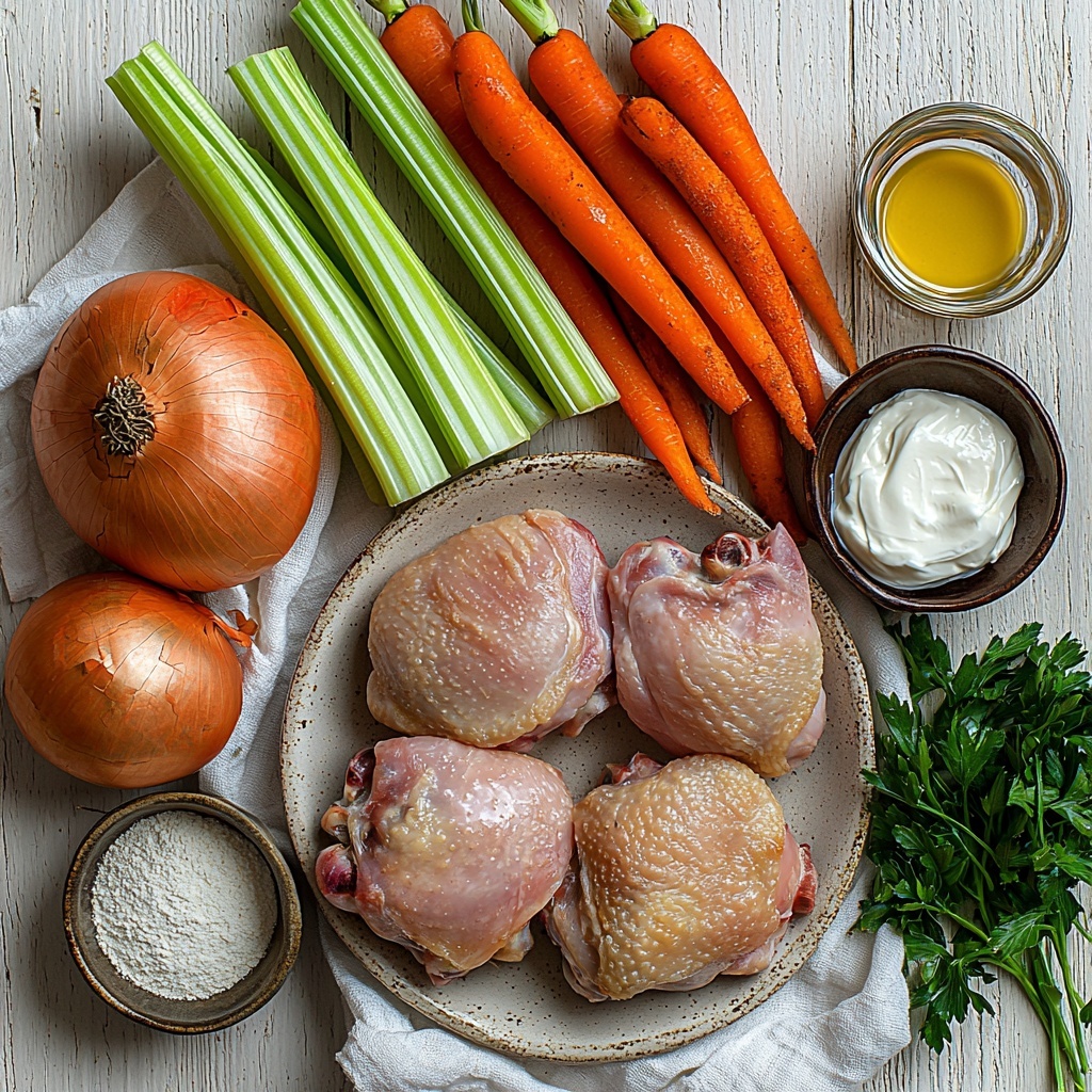 Start by rinsing the chicken thighs and patting them dry to ensure a nice sear if you choose to brown them first. Chop the onions, celery, and carrots into evenly sized pieces so they cook uniformly. Fry the bacon until crisp and then chop it roughly. This preparation step is essential because it sets the stage for even cooking and layers of texture.