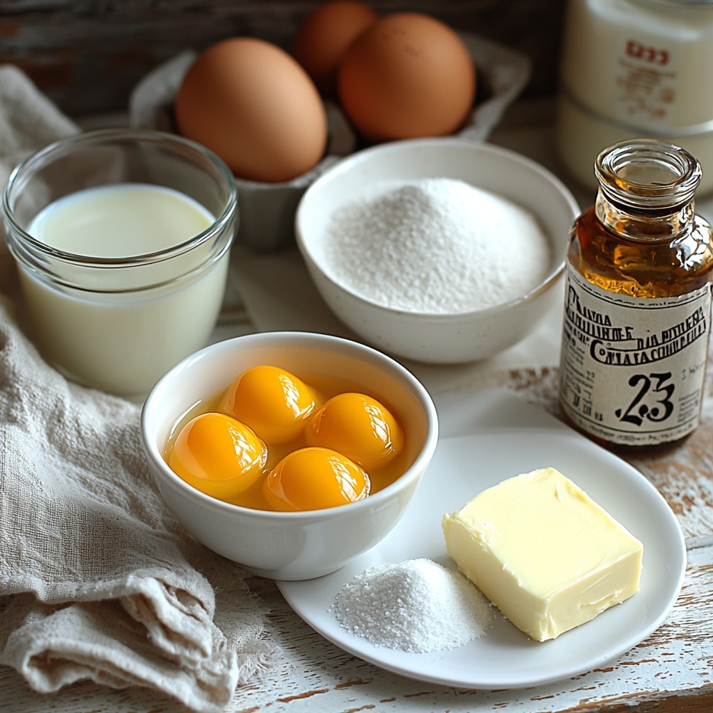 The beauty of this Homemade Vanilla Custard Recipe lies in its simplicity. Each ingredient plays a vital role in building the custard’s rich flavor, creamy texture, and beautiful golden color. Let’s take a closer look at what you’ll need: