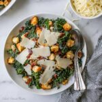 - Assemble the Salad: Transfer the dressed kale to a serving platter. Top with the crispy bacon pieces, bacon fat-coated croutons, and freshly shaved parmesan cheese. Serve immediately and enjoy alongside your favorite protein if desired.