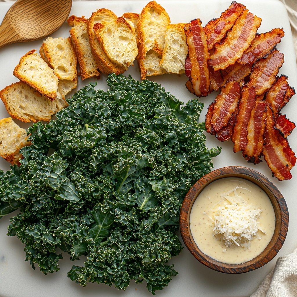 Every ingredient in this salad plays a crucial role in building layers of flavor and texture. From the robust kale to the salty bacon croutons, these ingredients are simple yet essential to deliver that perfect balance of creamy, crunchy, and savory notes.