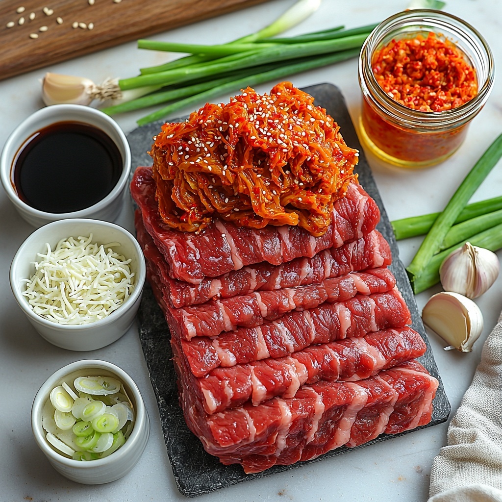 These ingredients keep the Keto Spicy Kimchi Bulgogi Cheesesteak Bowl Recipe straightforward yet sensational, bringing together classic Korean flavors with a cheesesteak twist. Each one plays a vital role—from infusing the meat with deep umami to adding the perfect creamy melt and that signature heat and tang from the kimchi.