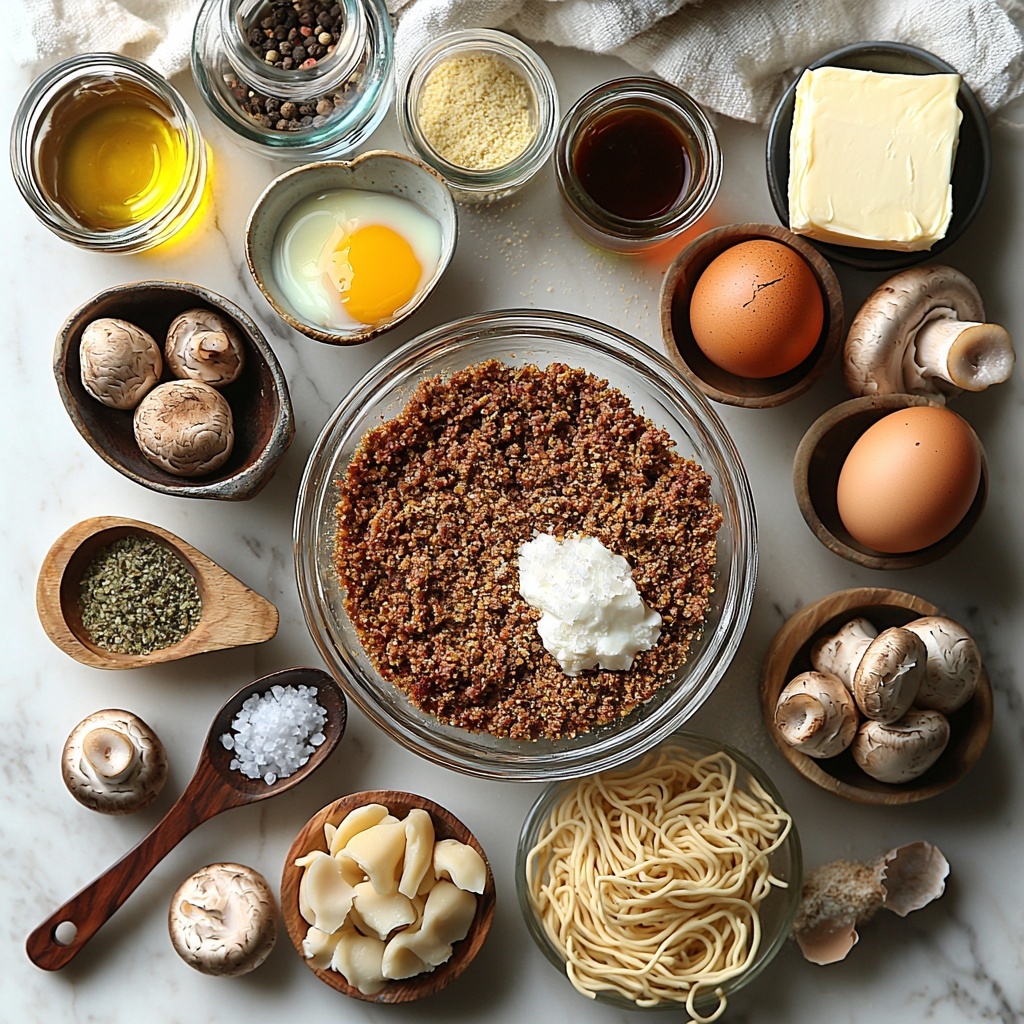 This comforting Meatball Stroganoff combines tender Italian-seasoned beef and pork meatballs baked to perfection, served in a rich and creamy mushroom sauce with tender egg noodles. The sauce features a flavorful blend of beef and chicken broth, white wine, sour cream, and a medley of herbs and spices, creating a classic dish perfect for hearty family dinners.
