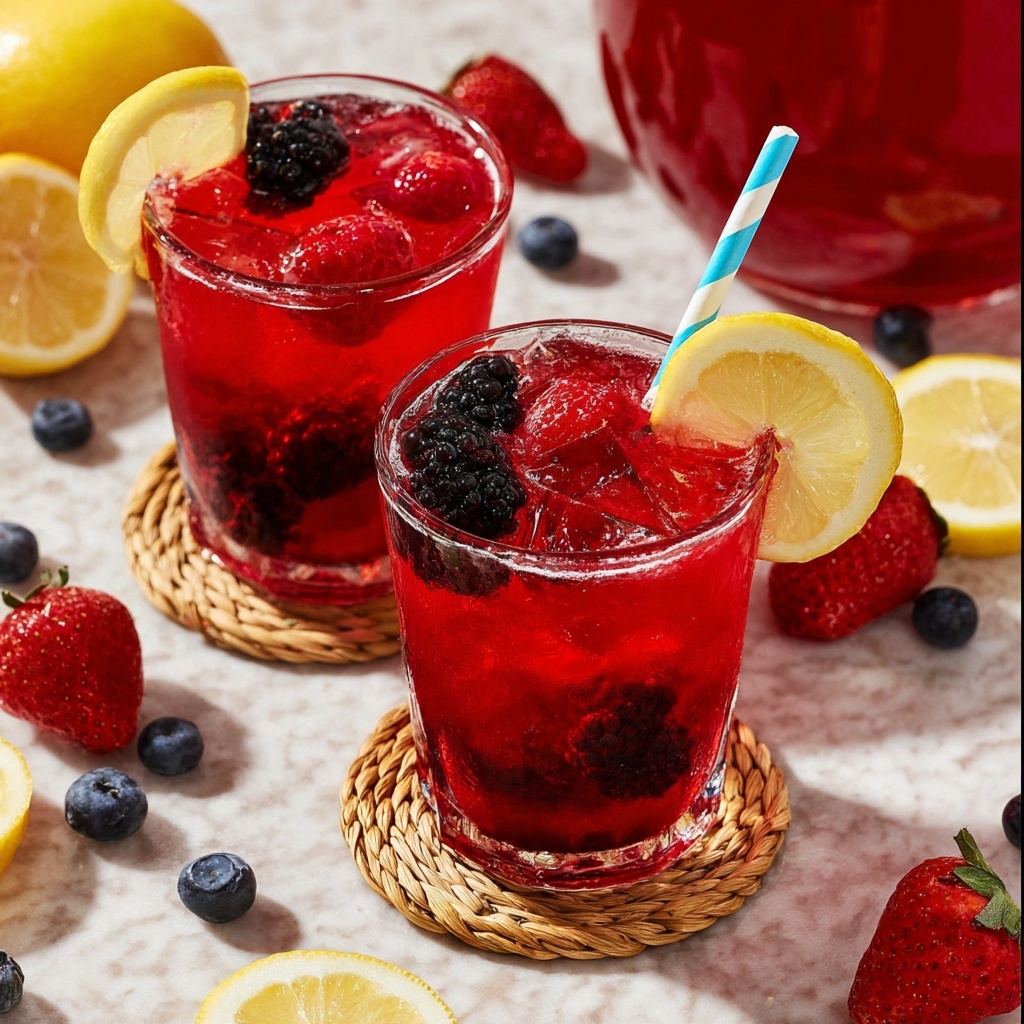 7. Serve: Fill highball glasses with ice, pour the mixed berry lemonade over, garnish each glass with a lemon slice and a few berries if desired, and serve with a straw for a refreshing presentation.