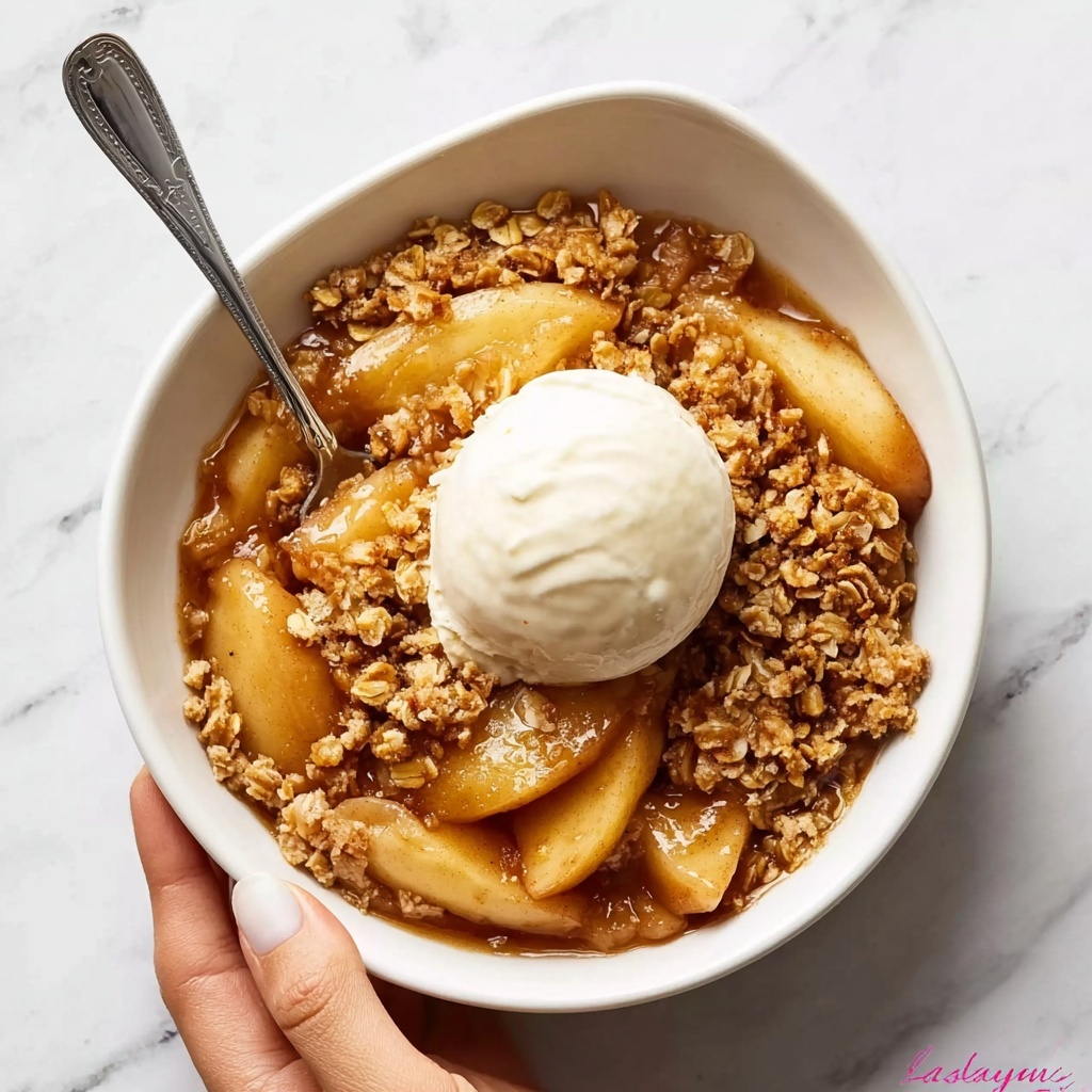 8. Serve: Serve the apple crisp warm, optionally topped with vanilla ice cream or whipped cream for an extra indulgent touch.
