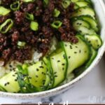 - Serve: Spoon the savory beef mixture over steamed jasmine rice. Garnish with cucumber ribbons, sliced spring onions, toasted sesame seeds, and finish with a drizzle of sesame oil for extra aroma and flavor.