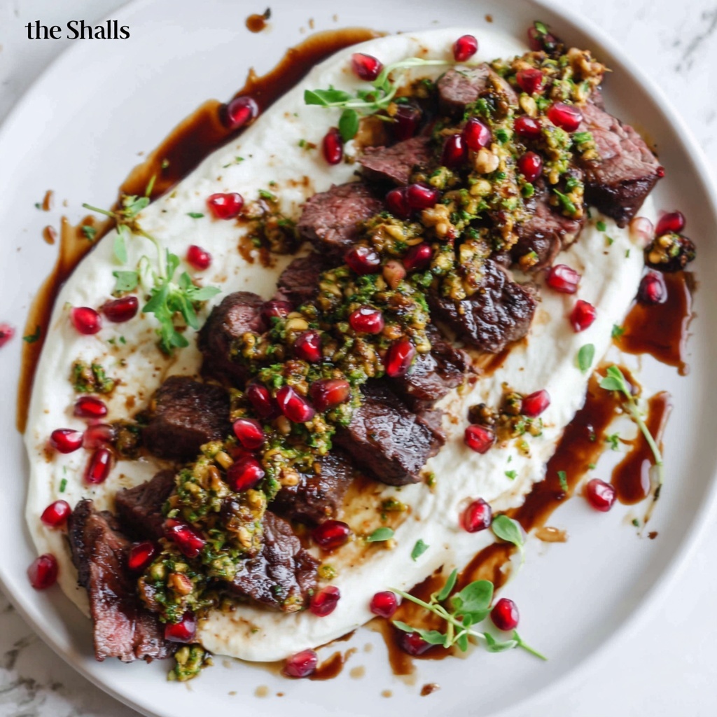 This Pomegranate Skirt Steak with Whipped Feta recipe features a tender, juicy skirt steak seared to medium rare and topped with a creamy, tangy whipped feta and Greek yogurt mixture. Garnished with vibrant pomegranate seeds, crunchy pistachios, and fresh scallions, this dish is perfect for an elegant yet easy weeknight dinner or special occasion. Serve it alongside warm flatbreads or pita for a complete Mediterranean-inspired meal bursting with flavor and texture.