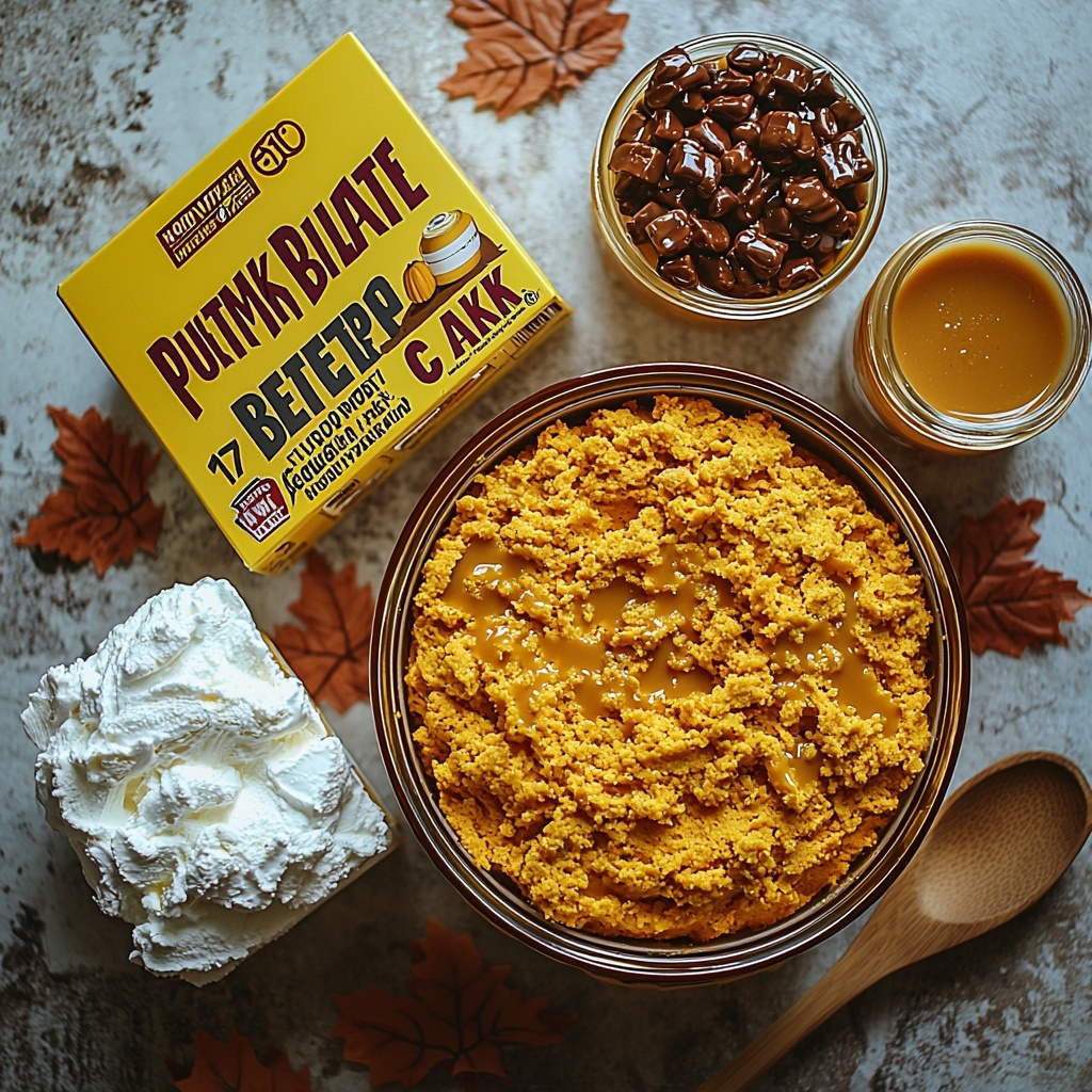 This recipe keeps it wonderfully simple with a handful of essential ingredients, each contributing a unique element to the final cake. From the moist pumpkin puree lending moisture and that signature fall flavor, to the yellow cake mix that ensures a light, fluffy base, every component plays a delicious part. The Cool Whip adds creamy sweetness, while Heath bits bring a satisfying crunch and caramel drizzle offers that perfect finishing touch.