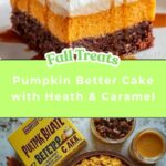 Pumpkin Better Cake is a delicious, moist yellow cake infused with pumpkin puree and topped with sweetened condensed milk, Cool Whip, Heath candy bits, and caramel sauce. This easy-to-make dessert combines the flavors of fall with a creamy, indulgent topping, perfect for gatherings or special occasions.