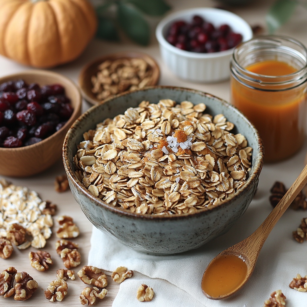 A wholesome and delicious pumpkin oatmeal granola recipe that combines hearty oats, crunchy walnuts, and nutrient-rich pumpkin seeds, all bound together with almond butter, maple syrup, and pumpkin puree. This granola is spiced with warm pumpkin pie spices and baked to a perfect golden crunch, ideal for breakfasts, snacks, or topping yogurt.