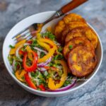 This vibrant Crab Salad features flake-style imitation crab tossed with thinly sliced onions, colorful bell peppers, fresh lime juice, cilantro, and olive oil. The onions are softened with salt and lime juice to mellow their sharpness, then combined with the other fresh ingredients and marinated for a few hours to develop bright, tangy flavors. Perfect as a light, refreshing appetizer or side, served with chips or tostones.