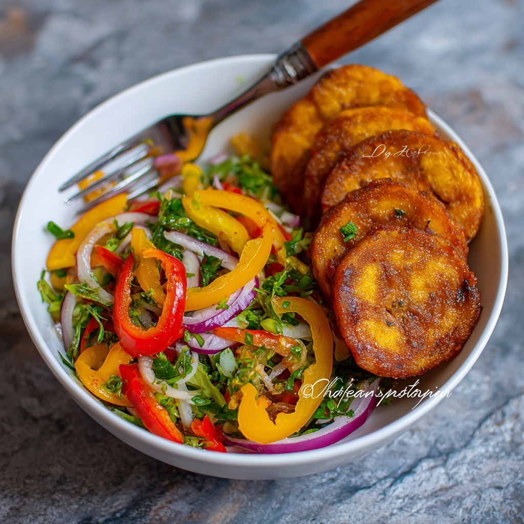 This salad pairs wonderfully with crunchy tortilla chips or crispy tostones, offering contrasting textures that make the eating experience even more enjoyable. For a heartier meal, try serving it alongside a light quinoa pilaf or a simple avocado and tomato salad to keep things lively and healthy.