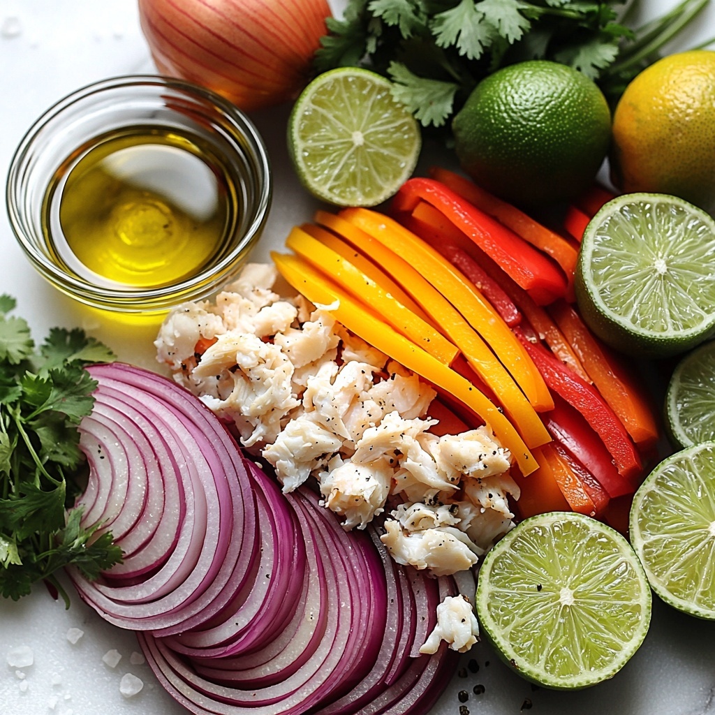 While the onions are resting, slice the bell peppers into crisp strips about ¼ inch thick, then halve those strips for easy bites. Flake apart your imitation crab gently so you don’t lose its delicate texture. Mince your cilantro finely; these bright green flecks will tie the entire dish together. Get your limes ready to juice fresh—it really makes a difference!