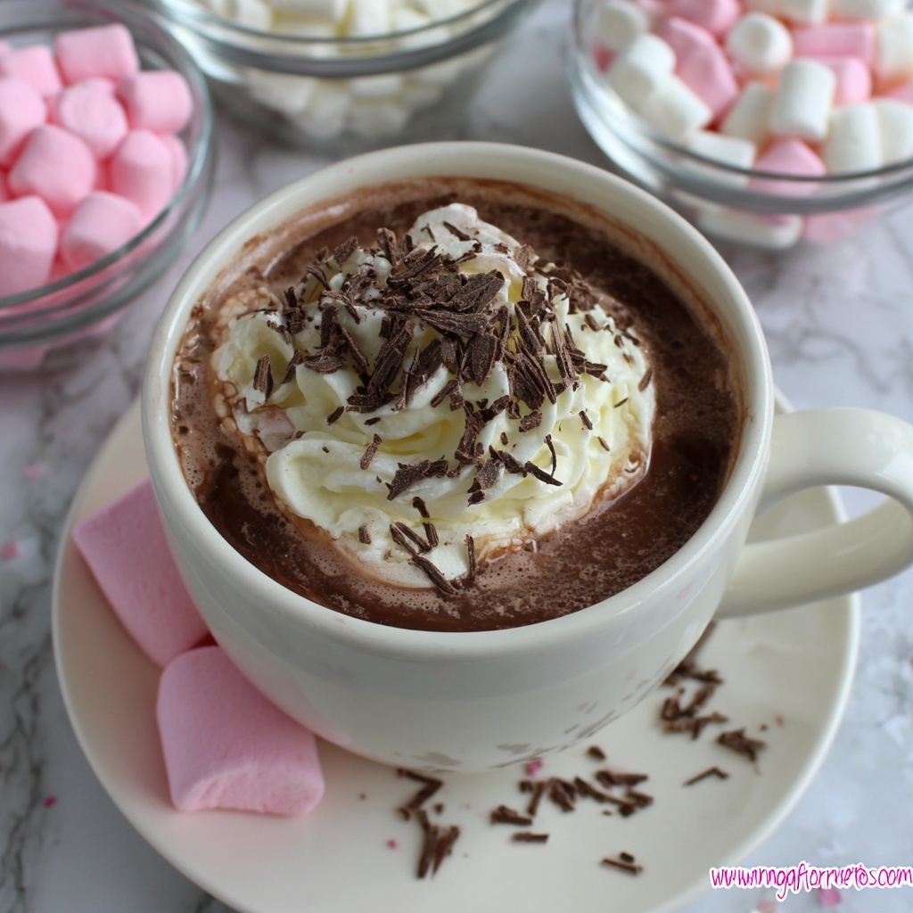 6. Serve: Pour the rich hot chocolate into mugs. Top with whipped cream or marshmallows if desired and serve immediately while warm for the best taste experience.