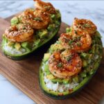 These Shrimp Avocado Cucumber Boats are a fresh and flavorful low-carb appetizer or light meal. Crisp cucumber quarters act as edible boats filled with creamy lime-infused avocado mash, savory sushi rice, and perfectly spiced sautéed shrimp. Topped with a spicy mayo drizzle and toasted sesame seeds, this dish delivers a delightful contrast of textures and vibrant flavors, perfect for warm days or elegant gatherings.