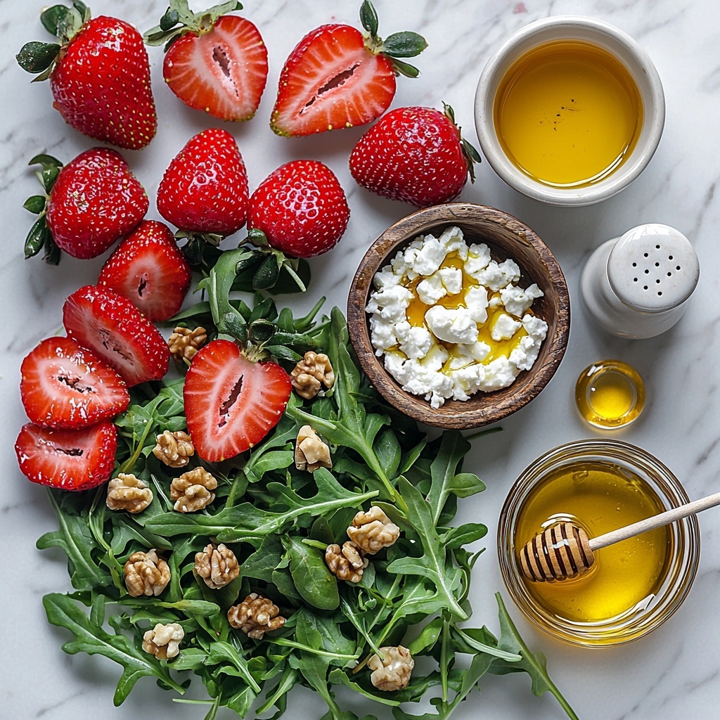 1. Combine Base Ingredients: In a large salad bowl, add the fresh rocket and sliced strawberries, mixing gently to start distributing the flavors.