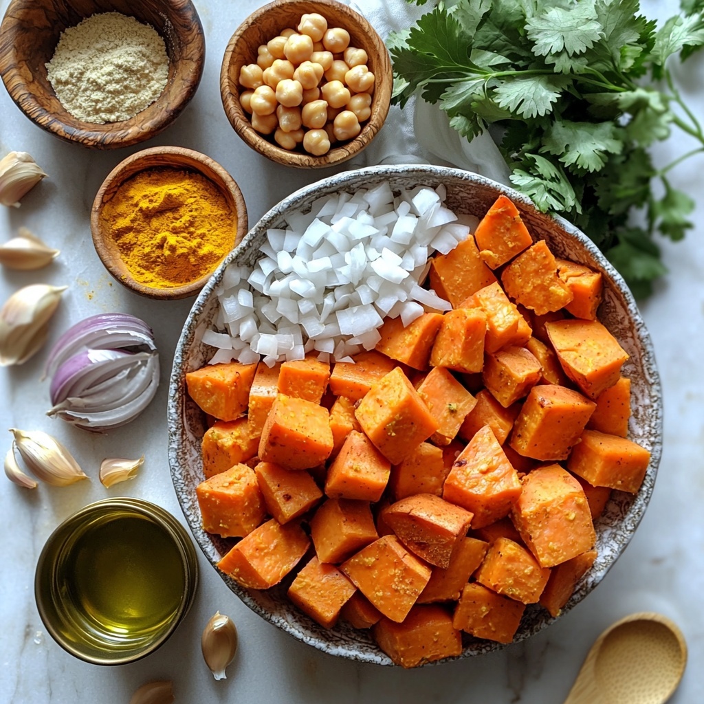 The beauty of this Sweet Potato and Chickpea Curry Recipe lies in its simple yet essential ingredients, each carefully chosen to build layers of flavor, texture, and color. These pantry staples come together effortlessly to create a dish that tastes like it took hours to prepare.