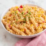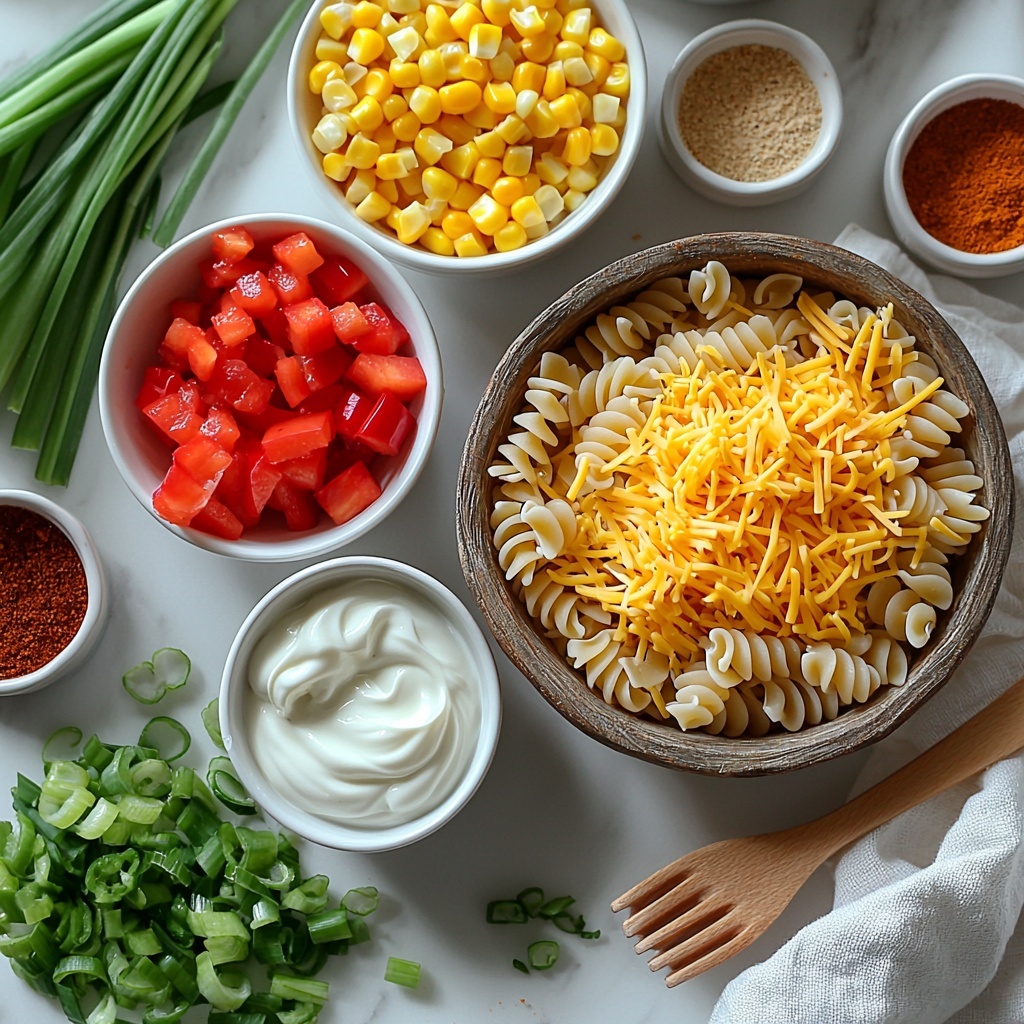 - Add vegetables and cheese: Incorporate the diced green onions, red bell pepper, drained corn, and shredded Mexican blend cheese into the pasta mixture. Gently toss again to combine all ingredients evenly.
