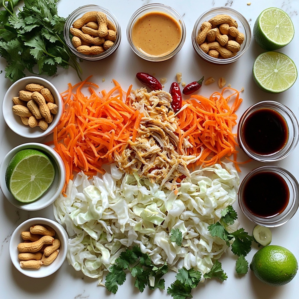 In a large bowl, mix together the shredded cooked chicken, crisp shredded cabbage, sweet shredded carrots, chopped peanuts, fresh cilantro, green onions, and optional Thai chilies or jalapenos. This combination of fresh, crunchy, and savory ingredients ensures every bite is bursting with texture and flavor.