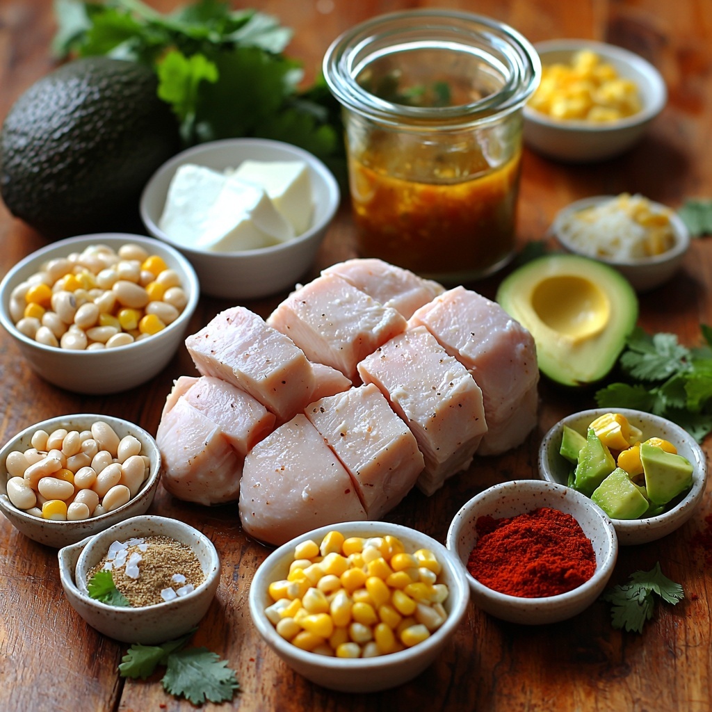 Start by gathering all your main ingredients into your slow cooker – the chicken breasts, white beans, corn, diced green chiles, chicken broth, and the carefully measured spices including cumin, chili powder, onion powder, garlic powder, salt, and pepper. Give everything a good stir to blend those lovely flavors before cooking.
